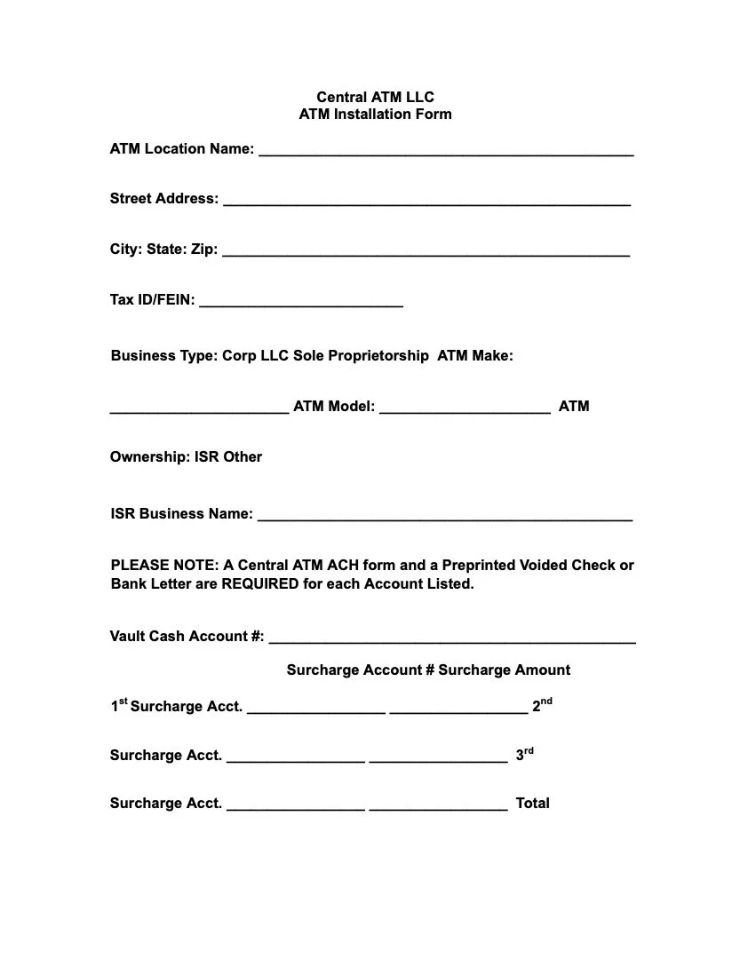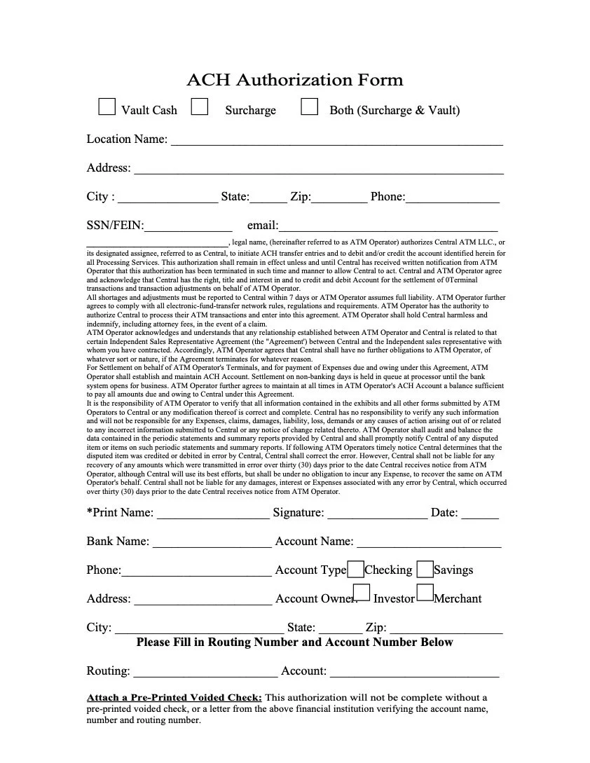 Downloadable Forms ACH Authorization Form Click here to download ACH Authorization Form Central ATM Installation Form Click here to download Installation Form ATM Operator/ATM Source Of Funds Agreement Click here to download ATM Operator Agreement / ATM Source of Funds Provider